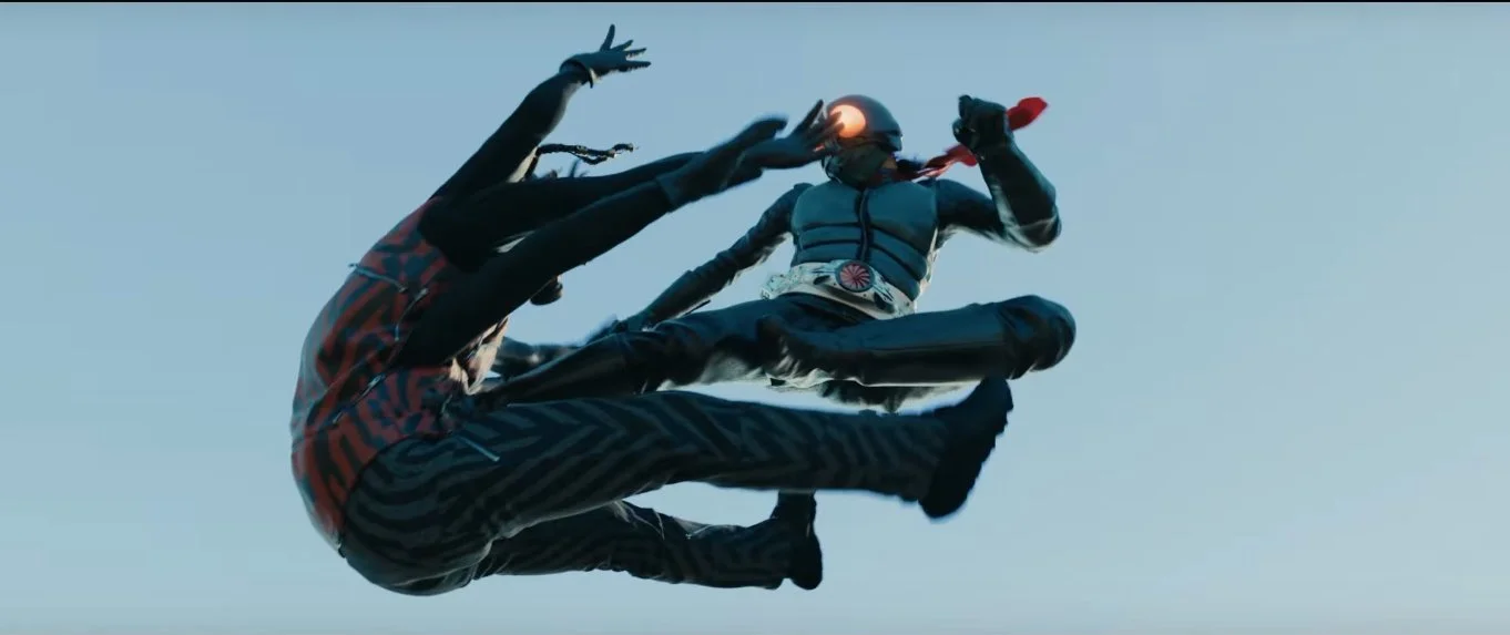 As with the previous two “Shin” films, Shin Kamen Rider is a back to basics look at the original. It strips back the lore and history and gives the audience a man who has been horrifically transformed, but has gained great power and the ability to stop others from experiencing the same fate. Hongo is shown to be an intelligent man, but he is not some kind of super-genius who can figure out a perfect resolution to the problems he is presented with. He is put into life-or-death situations and does the best that he can. The film does not shy away from blood and the fights against the armies of faceless grunts make the audience feel as unsettled as Hongo. It’s a dirty business and we mourn our hero for being the one who has to do it. While Hongo is rarely successful in trying to talk his enemies down, it is still important that he does so as it keeps him from becoming a monster just like the ones he is fighting. When he actually does manage to be successful, it proves to be incredibly rewarding for him and more than makes up for all the failures. He is shown to be correct for always offering his hand. That said, the fights against the other “Augmented Humans” are a spectacle to behold. As one might expect from a series from 1971, the effects don’t necessarily hold up. Rather than turn away from that, Anno emphasizes it in the fight choreography. The film uses CG to replicate the janky wirework of the original. For the most part, it helps illustrate how heightened these super-humans are as they jump around industrial areas and exchange blows in mid-air. The film also uses rapid-fire cuts in the action sequences to give the impression of speed much like the original did. There are specific references to sequences from the original that are recreated in all their awkward glory. Compared to many modern superhero films which strive for more realistic action or at least something which adheres more closely to the laws of physics, Shin Kamen Rider happily does twenty backflips over the laws of physics before twisting into a flying kick. Fans of the original will clap their hands in delight, but some of the scenes might be off-putting to viewers without that background knowledge. One of Shin Ultraman’s flaws was that it was sometimes too easter-egg heavy. There were entire scenes which were incomprehensible without understanding what was being referenced. Compared to that, Shin Kamen Rider balances the references much better. There are still plenty of shout-outs for long-time fans, but they serve the story without that background context as well. There is a major injury that Hongo suffers later in the film which referenced a behind-the-scenes injury Hiroshi Fujioka (the actor who played Takeshi Hongo in the 1971 series) suffered which necessitated the introduction of a replacement Kamen Rider. It was a dramatic moment in the film, but it may be distracting to fans who recognize what’s about to happen. You can imagine the gleam in Anno’s eye when he was writing that scene and part of the fun for longtime fans is going to be seeing how many references he can fit into the story. It feels very much like a film written by a fan for the fans.